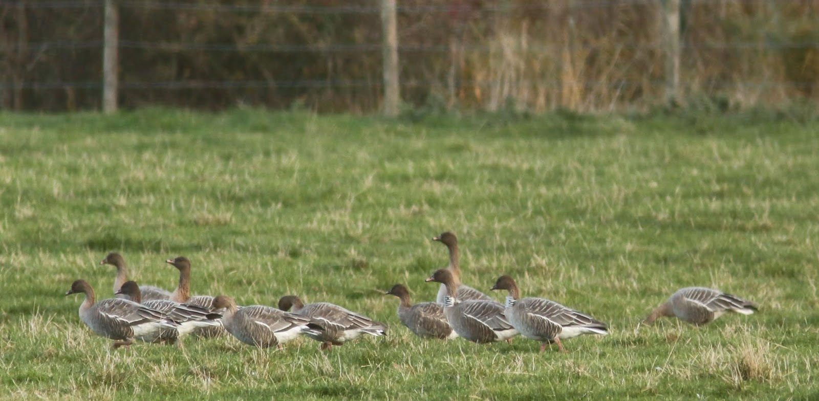 The area between the Skitter pools and Dawson City was far more productive on today's visit,with a single Cetti's Warbler at Ruins Pond,at least 2500 Lapwing,850 Pink-footed Geese,85 Dunlin,6 Bar-tailed Godwit,14 Grey Plover and a Rock Pipit.A light passage of Fieldfare saw 204 flying west up the estuary.